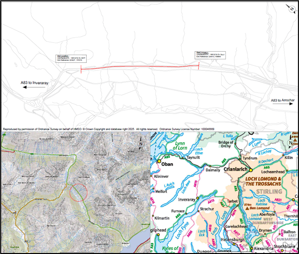 The scheme is located on a section of the A83 carriageway approximately 400m east of the RaBT viewpoint, within the Argyll and Bute Council region (Figure 1), with the following National Grid Reference (NGR) points: Start: NN 24013 06548 / End NN 23427 07274.