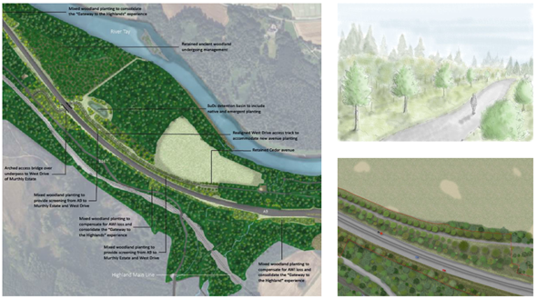 Specific mitigation measures include woodland planting to integrate the proposed scheme into the landscape. Where planting is specified, native and non-native plant species will be used to re-establish or reinforce landscape character. Whilst there is a focus on planting, mitigation measures will also influence the design of structures such as the River Tay Bridge, and SuDS features. Where exposure of rock cuttings is anticipated, such as at Birnam Junction between ch2000 and ch2400, mitigation includes creating a rugged, naturalistic appearance to reflect the character of the rock and fit with the surrounding landscape.