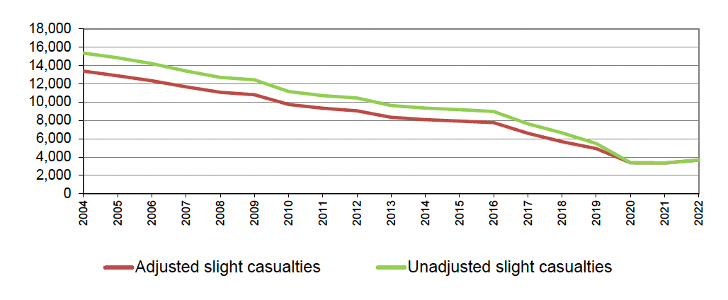 Figure B: DfT Adjusted/unadjusted slight casualties, 2004 to 2022