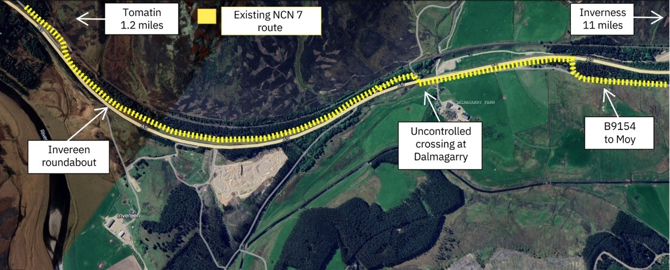 Instead of crossing the A9 at the Invereen roundabout, users will continue adjacent to the A9 northbound carriageway by an existing paved pathway for approximately 1.3km where they will then cross the A9 as they did previously, approximately 70m south of the Dalmagarry farm junction.