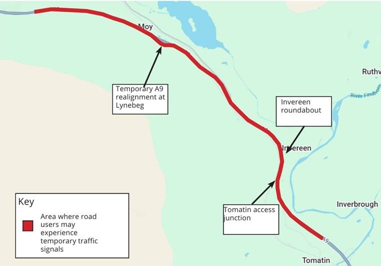 Overnight temporary traffic signals and a convoy system will be in operation on the A9 between Tomatin and Moy as part of the A9 Dualling: Tomatin to Moy works from 7:30pm to 6:30pm the following day for three nights, from Monday 9 February to allow for essential maintenance works to take place on the A9 carriageway.
